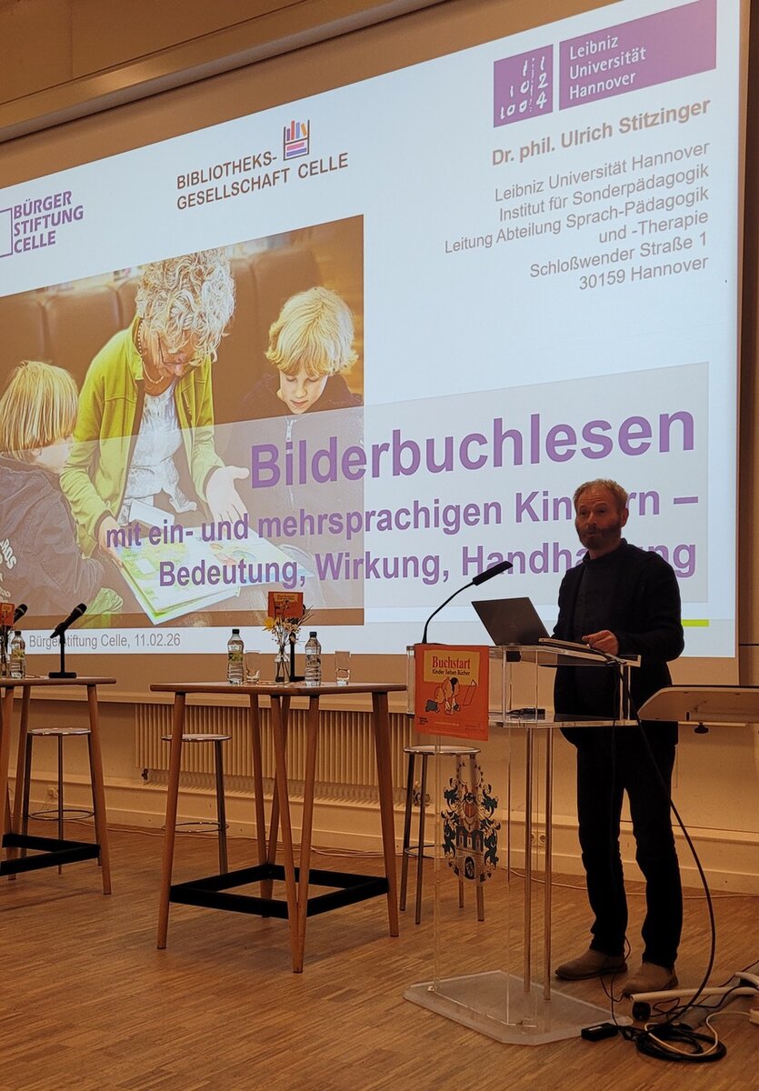 Niemand im Publikum hätte wohl damit gerechnet, sich auf eine Bilderbuch-Reise zu begeben und selbst vorgelesen zu bekommen! Aber Referent Dr. Ulrich Stitzinger vom Institut für Sonderpädagogik der Universität Hannover nutzte dieses Stilmittel gekonnt, um seine wissenschaftlichen Erkenntnisse zur Sprachentwicklung bei Kindern für alle Anwesenden gut nachvollziehbar und kurzweilig zu präsentieren.