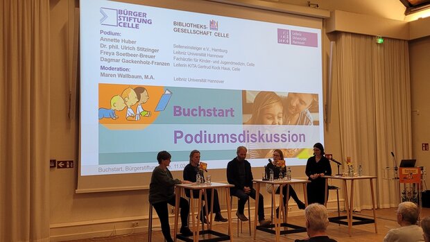 In der anschließenden Podiumsdiskussion mit Freya Soetbeer-Breuer, Fachärztin für Kinder-und Jugendmedizin in Celle, Dagmar Gackenholz-Franzen, Leiterin der KITA Gertud-Kock-Haus und Annette Huber, vom Verein Seiteneinsteiger e.V. Hamburg, vertiefte Dr. Ulrich Stitzinger unter Moderation von Maren Wallbaum, wie Freude am Lesen zu vermitteln wäre und eine lebendige Bücherkultur in Familien Fuß fassen könne.
